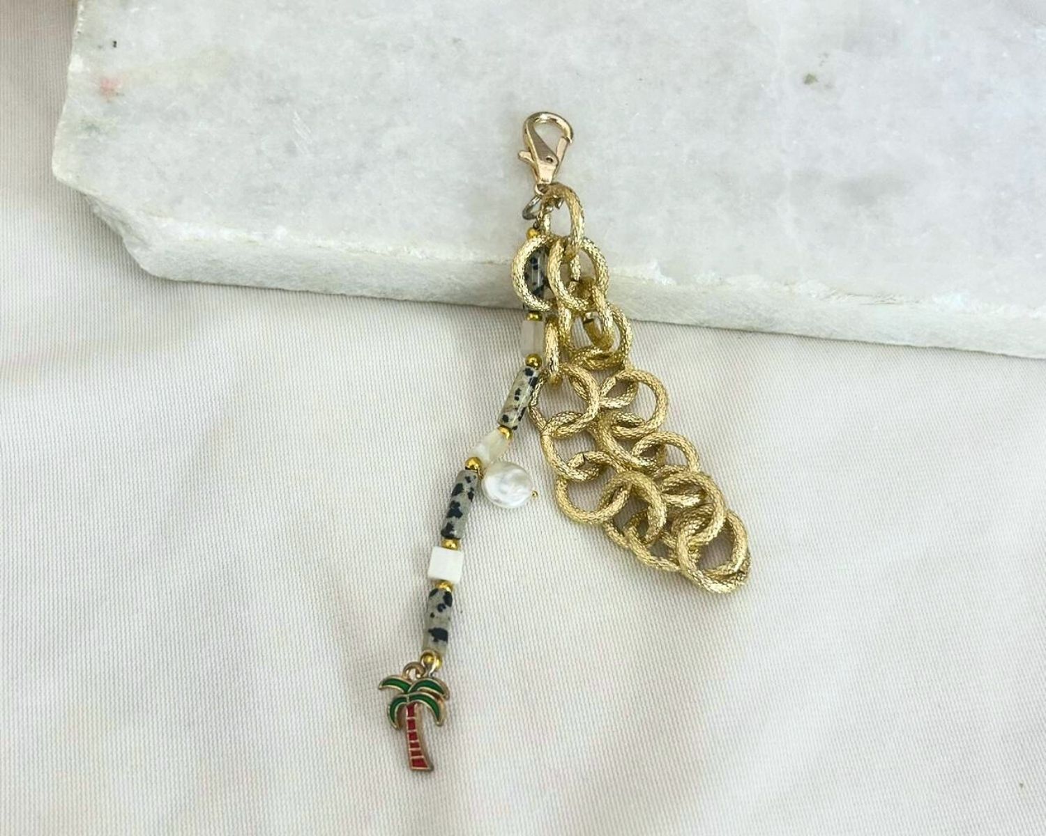 Daffodil is a playful bag charm featuring Dalmatian Jasper beads, subtle pearl detailing, and a textured gold-toned chain. Finished with a cute palm tree charm, it adds a light, cheerful accent to handbags, totes, and backpacks perfect for everyday styling.