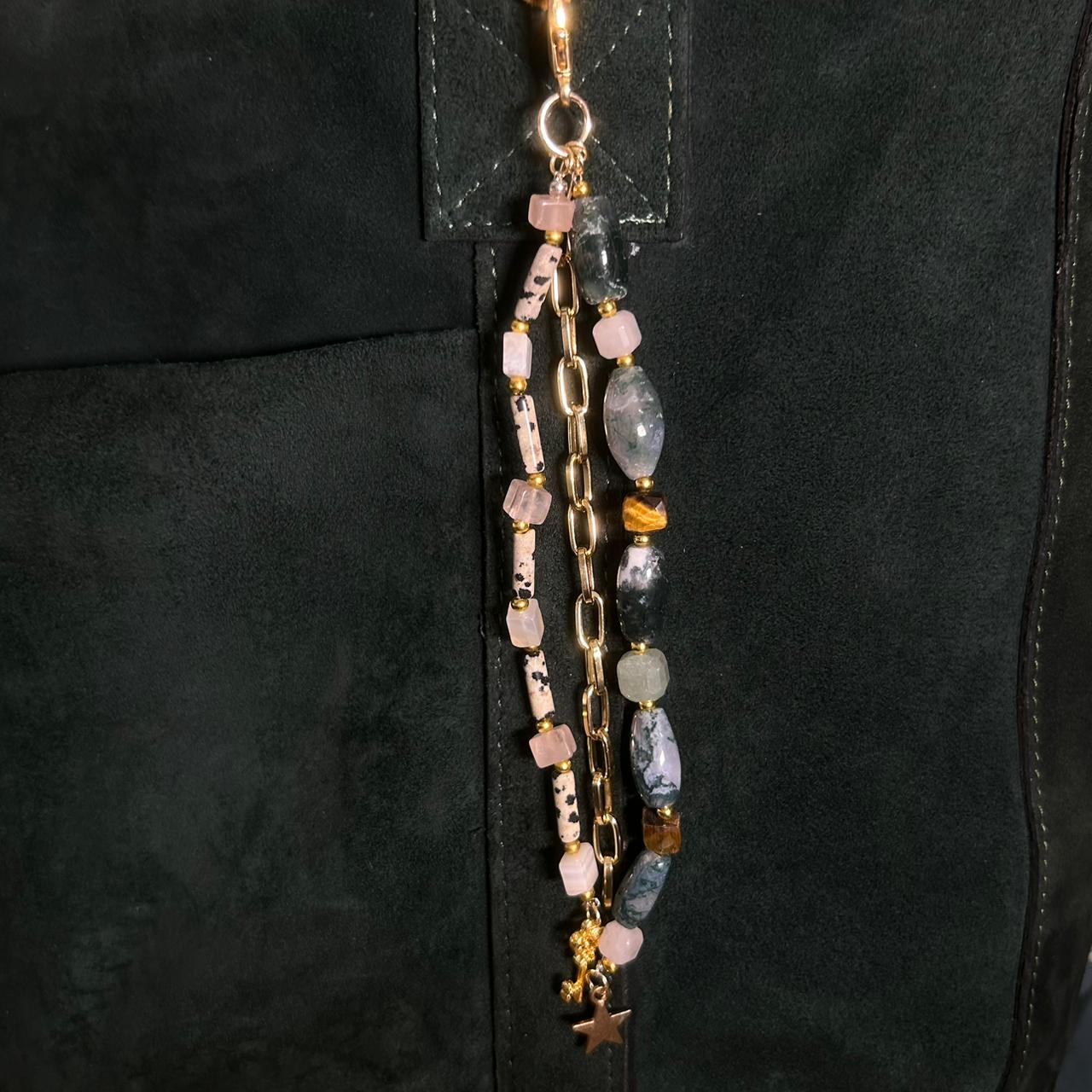 Azalea is a unique handcrafted bag charm designed with a blend of natural crystals Kyanite, Dalmatian Jasper, Moonstone, Amazonite, Rose Quartz, and soft neutral accents. The mix of spotted, pastel, and deep blue tones creates a playful yet elegant look, paired with a dainty star and key charm for added charm. Lightweight and easy to attach to handbags, totes, and backpacks, Azalea brings colour, personality, and a touch of meaning to your everyday carry.