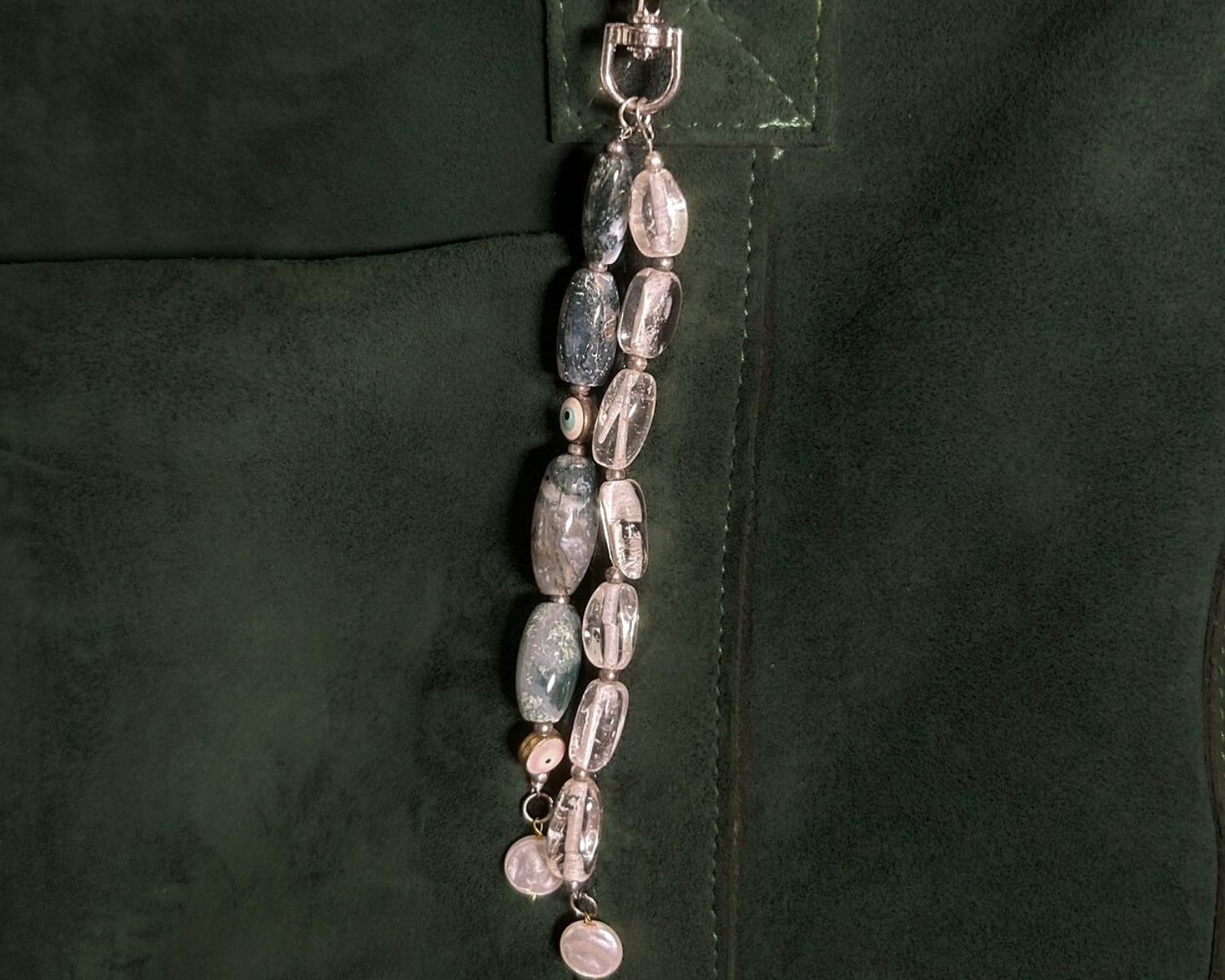 Cosmos is a thoughtfully handcrafted bag charm featuring a balanced pairing of clear Quartz and Moss Agate, finished with soft pearl accents and a subtle evil-eye detail. Designed to clip easily onto handbags, totes, or backpacks, it brings together earthy textures and gentle shine making it both stylish and symbolic for everyday use.