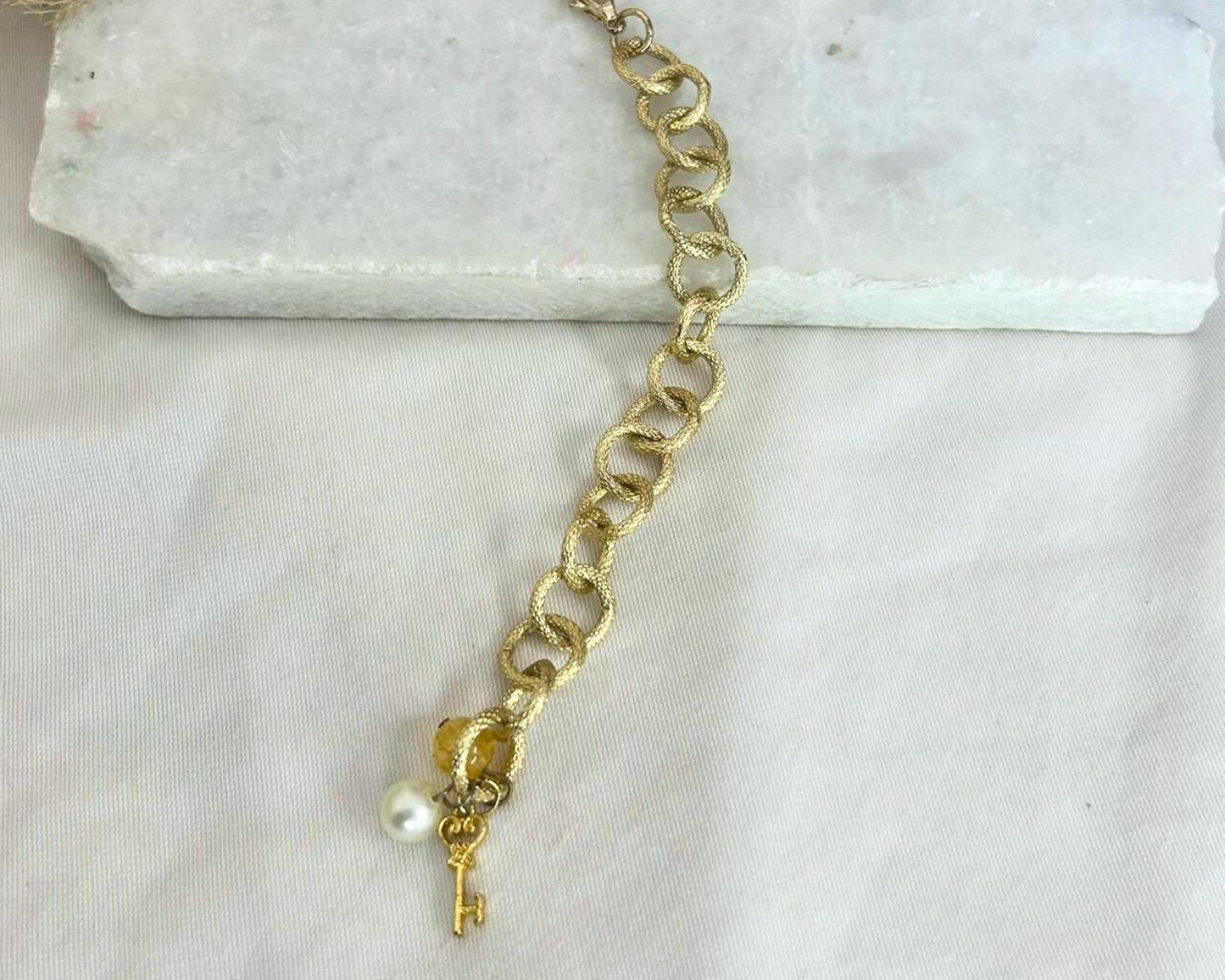 Dahlia is a minimal, handcrafted bag charm featuring a textured gold-toned chain accented with natural Citrine and a soft pearl drop, finished with a delicate key charm. Designed to clip effortlessly onto handbags, totes, or backpacks, it adds a subtle hint of shine and intention to your everyday carry. Simple, timeless, and easy to style.